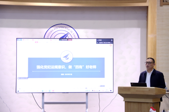 会议最后,闫伟带领全体人员学习了习近平总书记关于教师队伍建设的指示要求,以及国家和学校关于师德师风、保密和安全生产等相关规定,并以近年来教育系统和校内违规违纪典型案例展开警示教育,引导学院教职工举一反三、引以为戒,进一步强化纪律意识,恪守师德,时刻紧绷“作风、保密和安全”这根弦,杜绝任何违规违纪行为,营造风清气正的学院环境。
